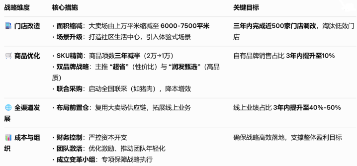 门店调改规模空前。公司计划三年内对近500家门店进行结构性调整,把大卖场面积压到6000-7500平方米。今年要改30多家,明年累计超过200家。对一家本就缺乏增长的企业而言,这意味着长期处在“营业被施工吞噬”的状态。